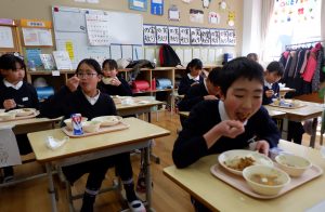 タイ料理のオリジナル給食を食べる児童ら=曽爾村