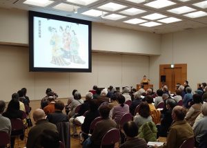 来村氏は関西大出身で、日本と中国の文化交流などを研究。高松塚壁画のうちの東壁男子群像について、主人にさしかける蓋が開かれ、西壁男子群像を含めて、前に進もうとしている姿を表現した絵だと指摘した。
