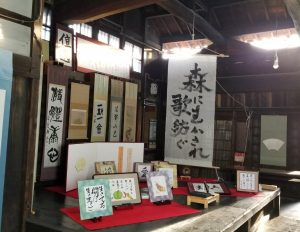 同NPO法人の参与、高石ともやさんや以前に縁のあった故・永六輔さん、合唱団メンバーらの作品を並べる。荒井敦子理事長は「森に生かされ歌紡ぐ」と書いた作品を披露する。