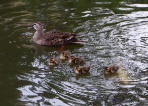 カルガモ親子、仲良くスイスイ 葛城市・調田坐一事尼古神社