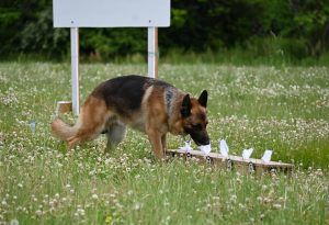 臭気選別部門は、サンプルの布のにおいを覚え、約10㍍離れた板の上に置かれた5枚の布から同一のにおいをかぎ分ける内容。同部門で優勝したシェパードのエンクハイゼン号(雄、6歳)の指導者、あすかドッグスクールの島田健司さんは、「事件解決や行方不明者の発見に貢献していきたい」と語った。