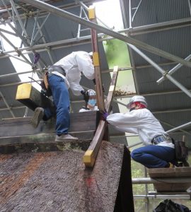 この日は、約2・4㍍の部材を交差させて屋根の両端を飾っている「千木」を取り外した。今後、屋根の葺き替えのほか朱や漆喰の塗り替えなどを行い、10月28日に仮殿に移っているご神体を戻す「本殿遷座祭」を営む。