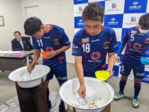 大和郡山市役所で金魚すくいの腕前を披露する奈良クラブの選手ら