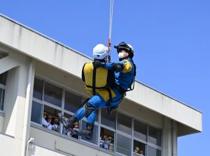 また、氾濫した河川で、中州に人が取り残された想定でも訓練。隊員は屋上からロープで要救助者の元へ降下し、吊り上げて救出する手順などを確認した。