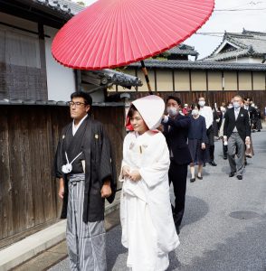 江戸時代の風情を残す五條新町通りをゆく花嫁行列=五條市