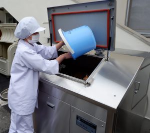 市立櫟本小では10月末、児童と保護者らが見学する中、給食調理員がゴボウやニンジン、ジャガイモの皮などを装置に投入した。6年の大門藍之介さんは「今まで捨てていた部分が再利用できるのはいいなと思う。フードロス問題を考えるうちに、給食を残さず食べるようになった」と話した。