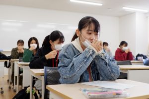 ドイツトウヒから抽出したアロマの香りをかぐ奈良学園大の学生たち=奈良市