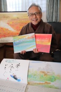 橿原市で創作活動を続ける画家、戸田勝さんが、各国の世界遺産の風景画と漂泊の俳人として名高い種田山頭火の自由律俳句の書画を楽しめる令和5年のカレンダーを完成させた。「平和の尊さ」をテーマに、風景画は水彩の優しい色使いで、書画は力強い筆致でそれぞれ描いている。