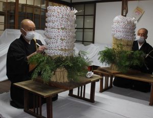 僧侶らは竹串に挟んだお札を、「ボテ」と呼ばれるわらの束に丁寧に差し込んでいった。正月三が日には金堂に祭られている千手観音立像の前に置き、午前8時半から1日約2千体をめどに授与する。