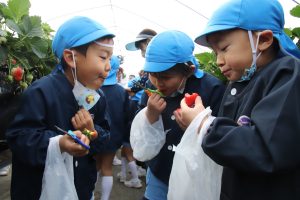 3年ぶりの開催となったセレモニーには、同幼稚園の園児24人が参加しハサミを手にイチゴを収穫。福井日菜さんは「甘くておいしい。何個でも食べられそう」と笑顔で話した。