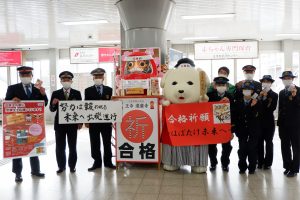 JR王寺駅では、大きなだるまが飾られ、電光掲示板に若手駅員が考えた「努力は裏切らない。『夢』への切符をつかみにいきましょう」とのメッセージを表示している。今月10日には、電車の「滑り止めの砂」500セットを無料配布した。受け取った同町の中学3年の女子生徒は中学受験を控えた小学6年の弟に砂を渡すといい、「体に気を付けて頑張ってもらいたい」と話した。