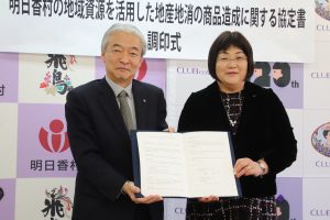 森川裕一村長は「明日香から全国、世界へと発信できる商品を開発していただきたい」と期待を寄せ、同社の中山ユカリ社長は「歴史ある村の地域資源を活用し、価値ある商品を開発したい」と語った。
