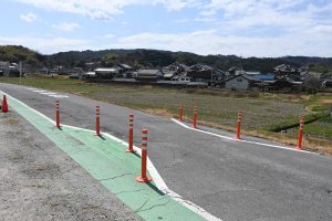 このため、市道は昨年6月に制限速度が時速30㌔とされ、今年2月にはオレンジ色のポストコーン8本を設置して 車道の一部の幅を約3㍍に狭めた。