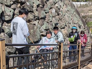 難病の筋ジストロフィーで下半身が動かない、奈良市の池本琴音さん(26)は「楽しかった。幸せ」と満面の笑顔。父親の晃さん(60)は「階段が多い施設は普段は入るのを断念することも多いが、家族3人で城からの眺めを楽しめた」と話した。