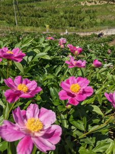 下市町平原のシャクヤクガーデンで、シャクヤクの花が見頃を迎えている。約2万平方㍍の花畑には、赤、白、ピンクの色鮮やかな大輪の花約3万本が一面に広がり、訪れた人たちを楽しませている。