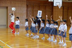 帝塚山大の学生たちによる交通安全教室が、奈良市の帝塚山小の体育館で開かれた。1年生約50人が交通ルールの大切さを学んだ。