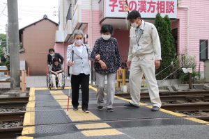 体験会には、県視覚障害者福祉協会や市障害者団体協議会のメンバーら12人が参加した。松木平初代さん(75)は「まだ慣れないので、一般の道路と踏切を区別することが難しかった」と話した。