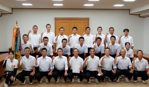 石井昭郎主将(17)は「近畿大会が終わってから3週間かけてチームを作り直し、レベルをもう一段上げられるよう練習を続けている」とした上で、「堅い守備からテンポを作るのがチームの持ち味。日本一を目指したい」と話した。並河氏は「自信を持って戦ってもらいたい。身体に気を付けて頑張ってください」と激励した。