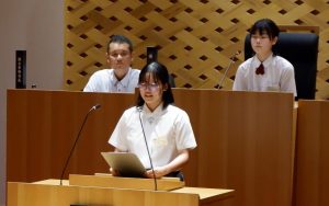 議場で学校生活や通学路について要望を述べる中学生=大和郡山市