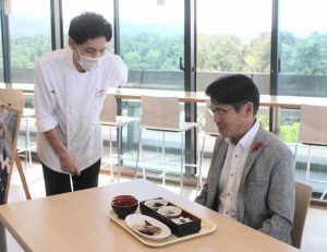 東京電力福島第1原子力発電所の処理水放出により風評被害を受けている福島県を応援しようと、奈良県は3日、県庁食堂で福島県産の食材を使った昼食の提供をスタート。開始を前に2日、山下真知事が食堂でメニューを試食し、味や安全性をPRした。