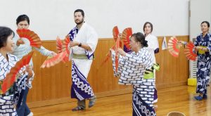 村体育文化センター(湯之原)で、国の重要無形民俗文化財に指定されている「十津川村の盆踊り」を体験。浴衣に身を包んだ留学生たちは、盆踊りの継承に取り組む「平谷餅搗き踊り保存会」のメンバーから指導を受けながら、盆踊りのステップを楽しんだ。