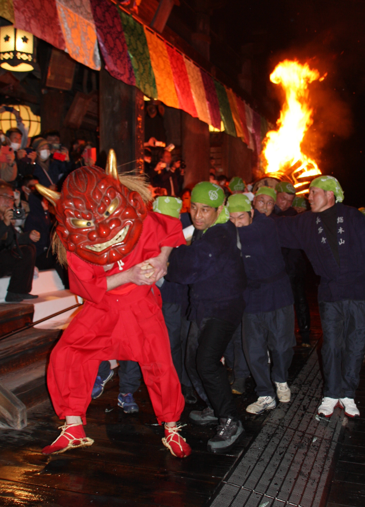 この日は本堂で法要が営まれたあと、太鼓やほら貝が堂内に響き渡る中、3匹の鬼が「うおーっ」と叫びながら大暴れ。僧侶に追い出されると、大たいまつを持って本堂の周りを歩いて退散した。