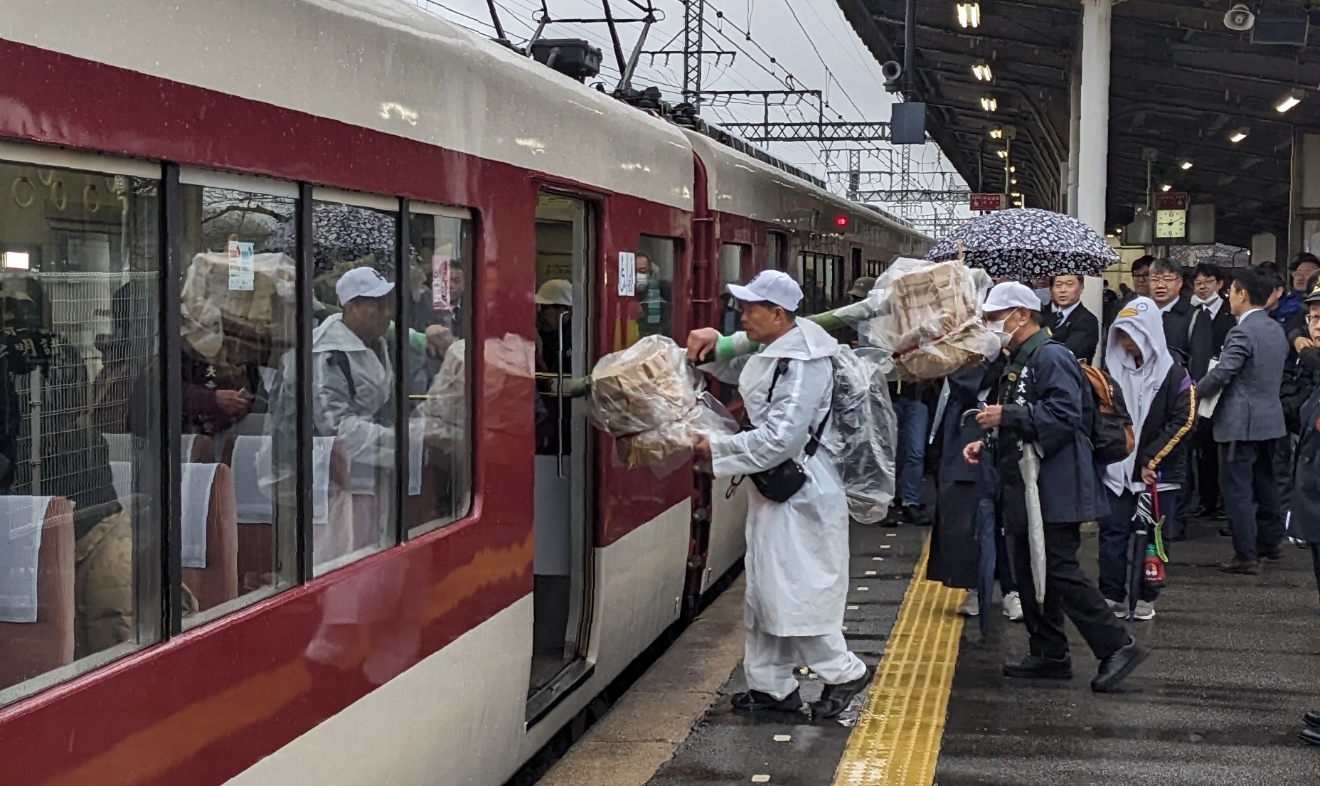 近畿日本鉄道は12日、東大寺二月堂の修二会(お水取り)で使われる松明を運ぶ列車に同乗するツアーを初開催した。参加者たちは、松明が赤目口駅(三重県名張市)から近鉄奈良駅(奈良市)まで40㌔近くの距離を列車で運ばれる様子を見届けた後、二月堂まで松明を担ぐなどして、春の伝統行事を体感した。
