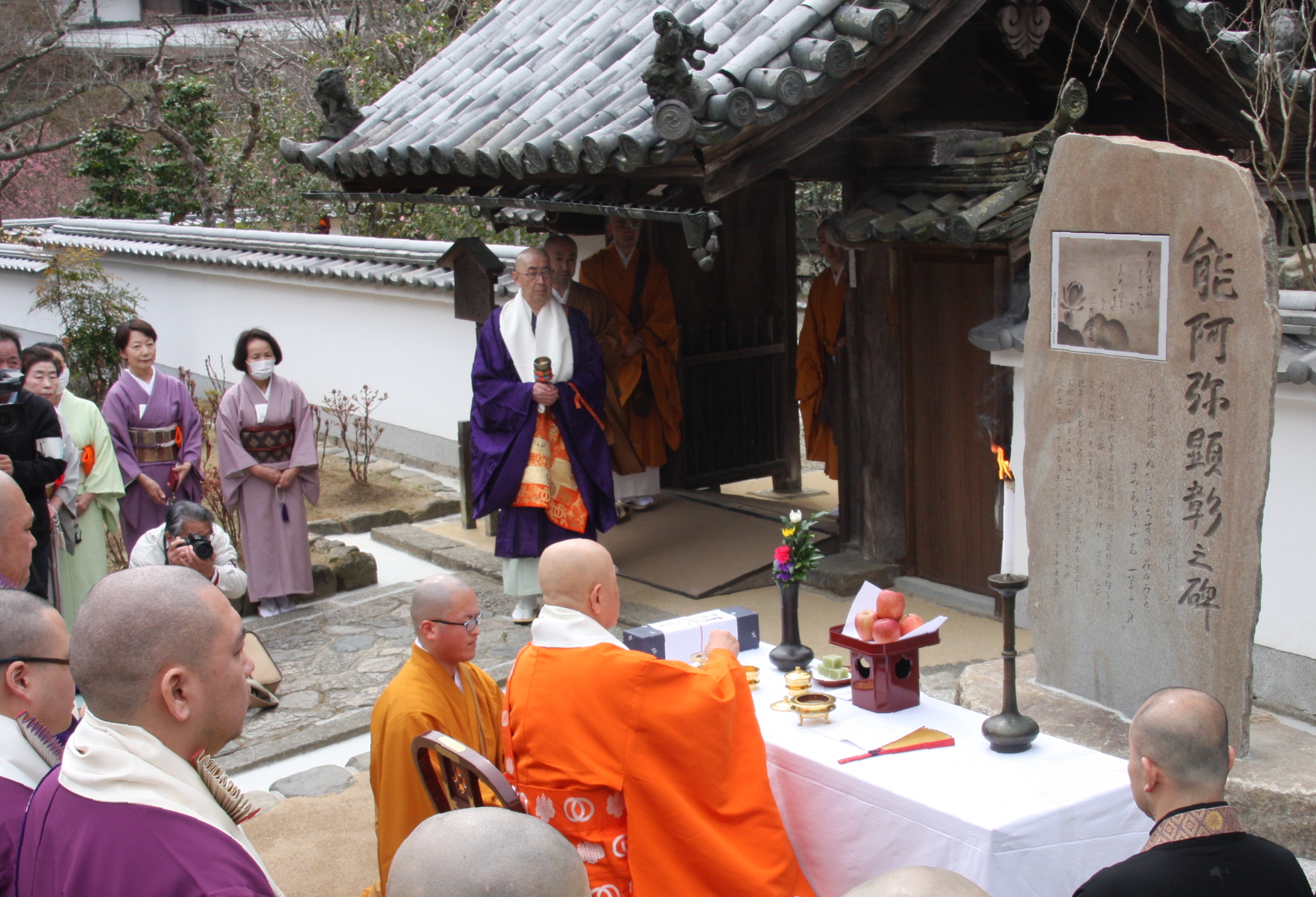 能阿弥を長年研究する茶道の武者小路千家家元後嗣の千宗屋さんと同寺が、能阿弥の功績をたたえようと顕彰碑(縦約2㍍、横約1㍍)を建立。高松市の庵治石が用いられ、能阿弥が晩年に描いた「蓮図」(国重要文化財)の写しが銅板として顕彰碑にはめ込まれている。