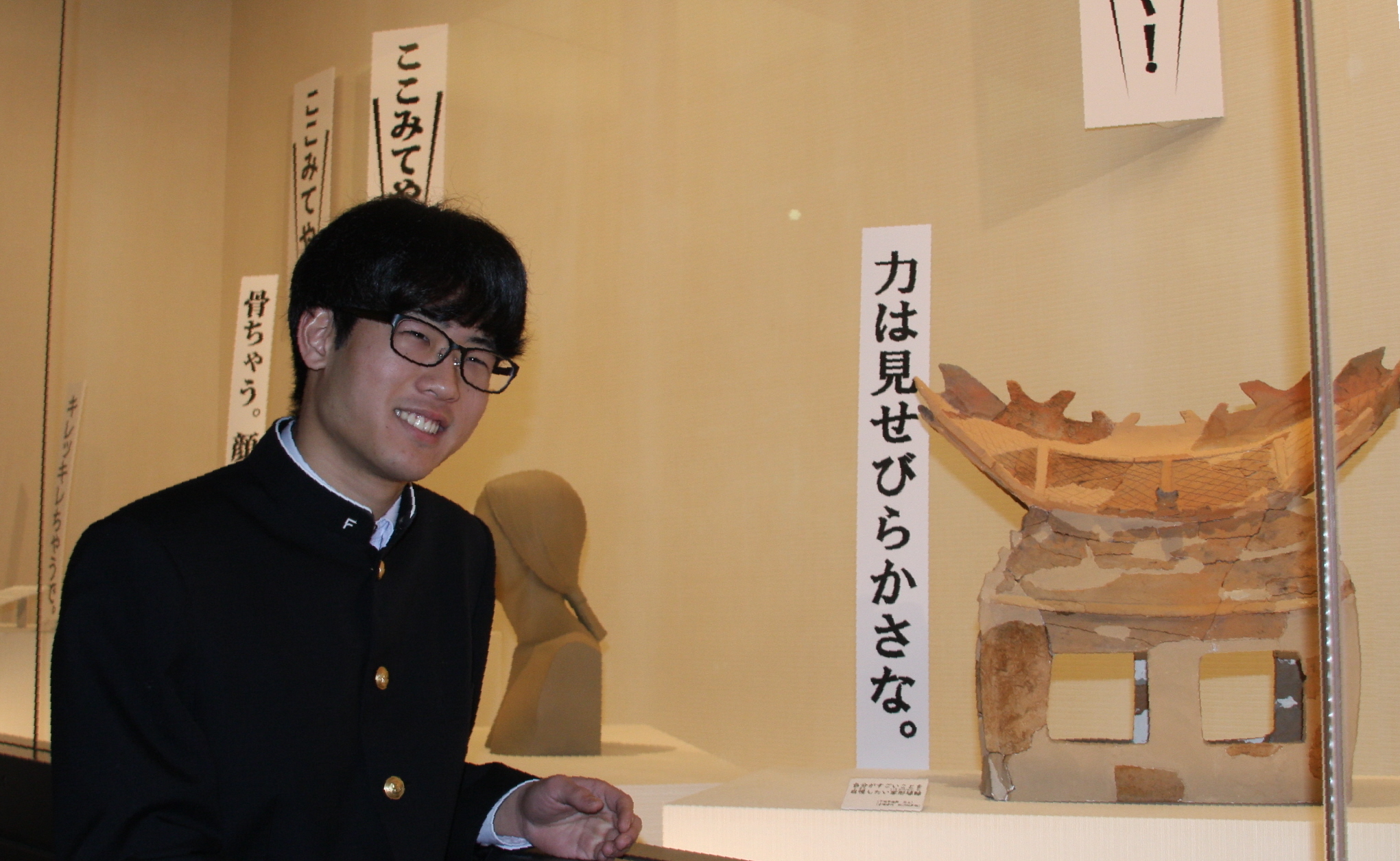 同館は、県立橿原高校と連携して平成28年度から企画展を開催。今回は、同校考古学研究部長の2年生、麻生彩斗さん(16)が参加し、同市文化財保存活用課の松井一晃・課長補佐とキャッチコピーなどを練り上げた。