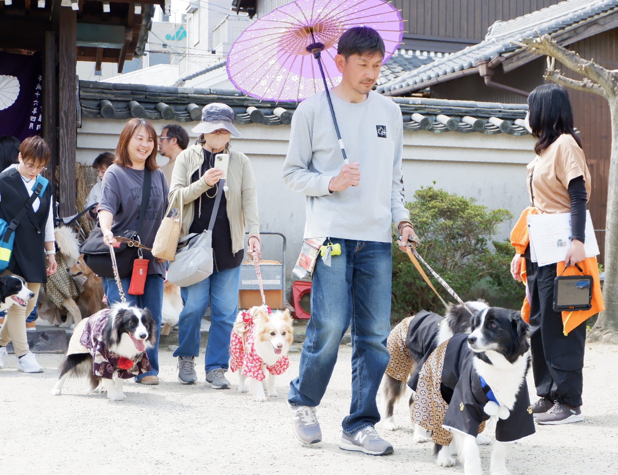 トイプードル2匹、ボーダーコリー2匹とともに夫婦で参加した愛知県豊橋市の農業、田嶋明さん(56)は「伝統的な行事に犬とともに参加できたことがとてもうれしい。いい記念になった」と笑顔。日野周圭住職(76)は「イヌの七五三詣でに寺を訪れる人は多い。イヌの稚児行列は初めての試みだが、今後も続けていきたい」と話している。