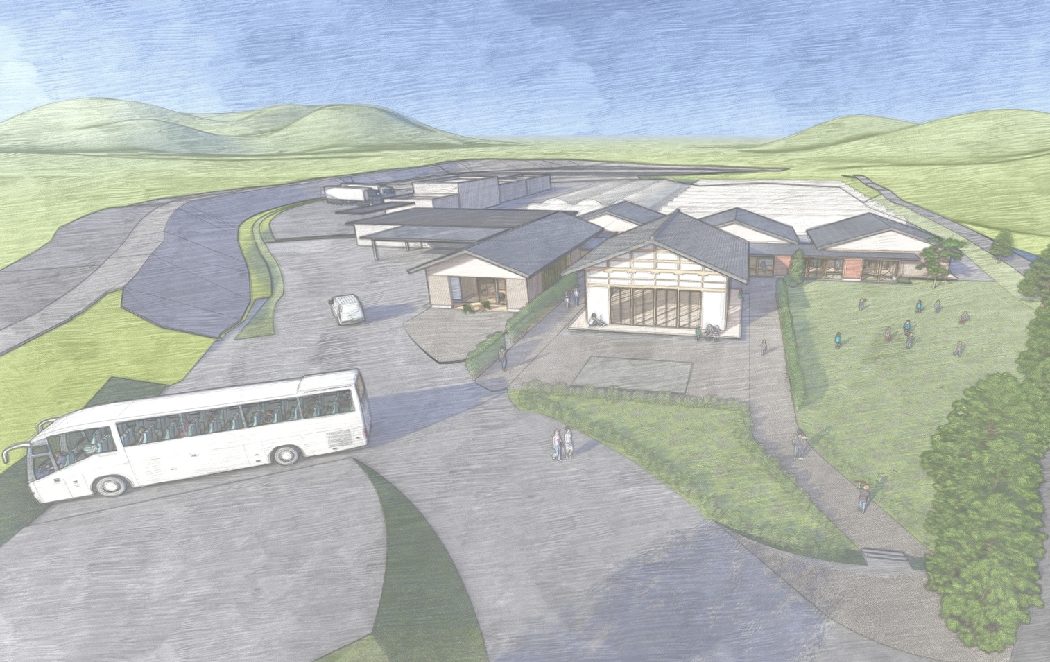 宿泊施設などは木造切妻造りの平屋建てとし、周囲の山並みの風景に溶け込むようなデザインにする。8月に着工し、宿泊施設などは来年11月にプレオープン、令和8年春の本格オープンを予定。人工知能(AI)も活用して消費者に安心安全で新鮮な農産物を届けるとしている。