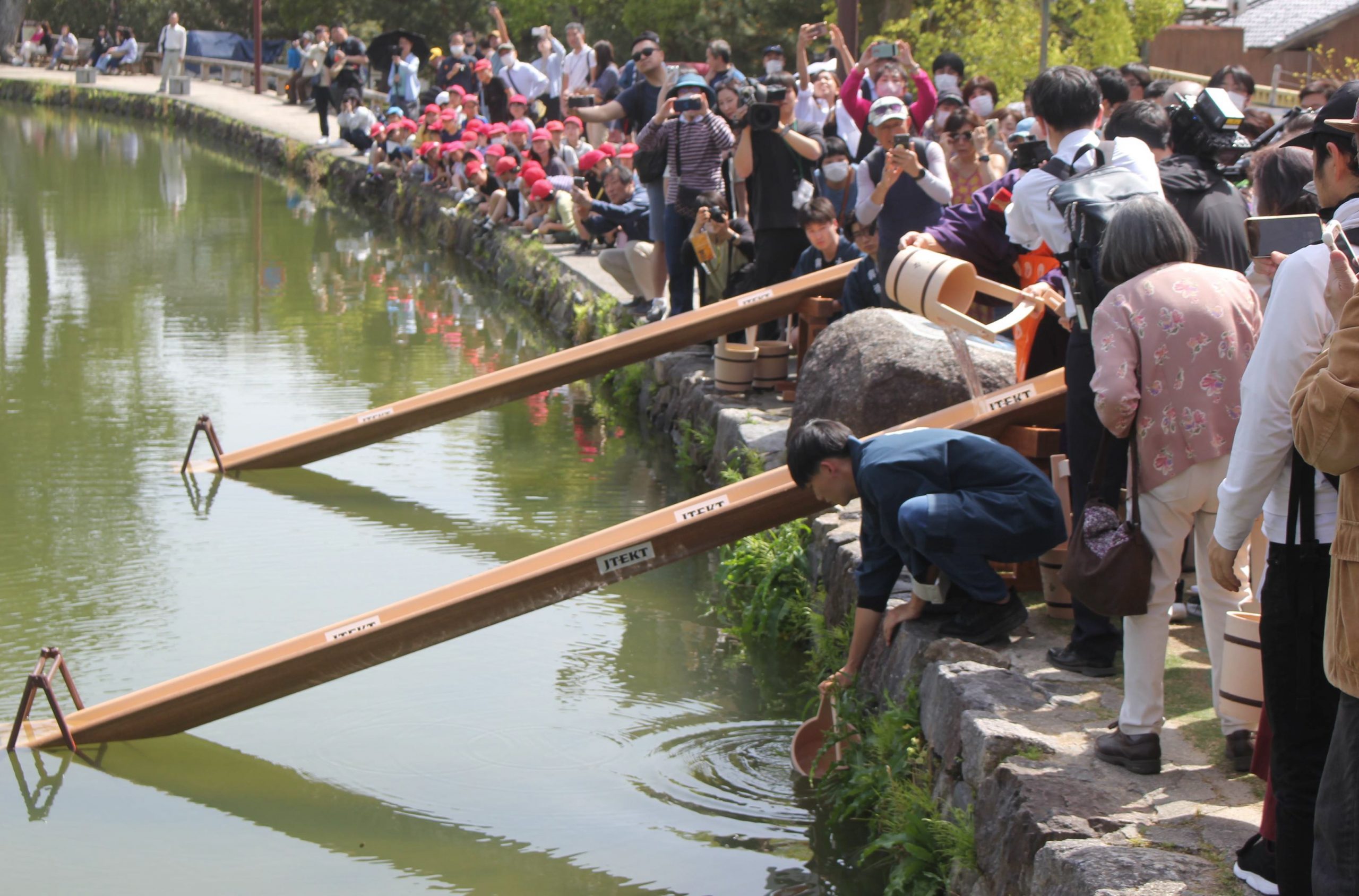 この日は南円堂北側にある一言観音堂で、森谷英俊貫首ら僧侶が法要を営んだ。その後、猿沢池のそばに移動し、僧侶が般若心経を唱えた後に、小学生らとともにスロープを使って池に魚を放流した。