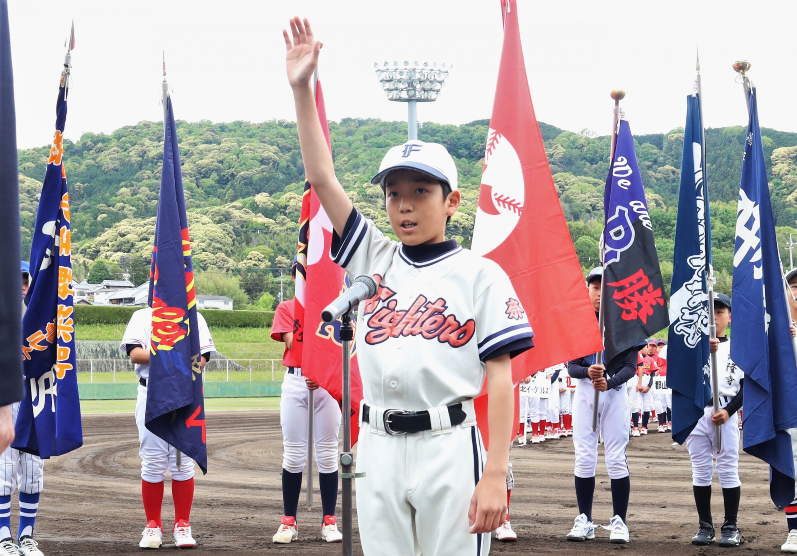 大会には、県軟式野球連盟の郡山・生駒郡両支部に登録する12の小学生チームが出場。同球場で27日に開会式が行われ、入場行進のあと、小泉ファイターズの6年、九十九悠翔副主将(11)が「最後まで諦めずに戦います」と選手宣誓した。引き続き、同球場など2会場で1、2回戦計8試合が行われ、ベスト4が決まった。
