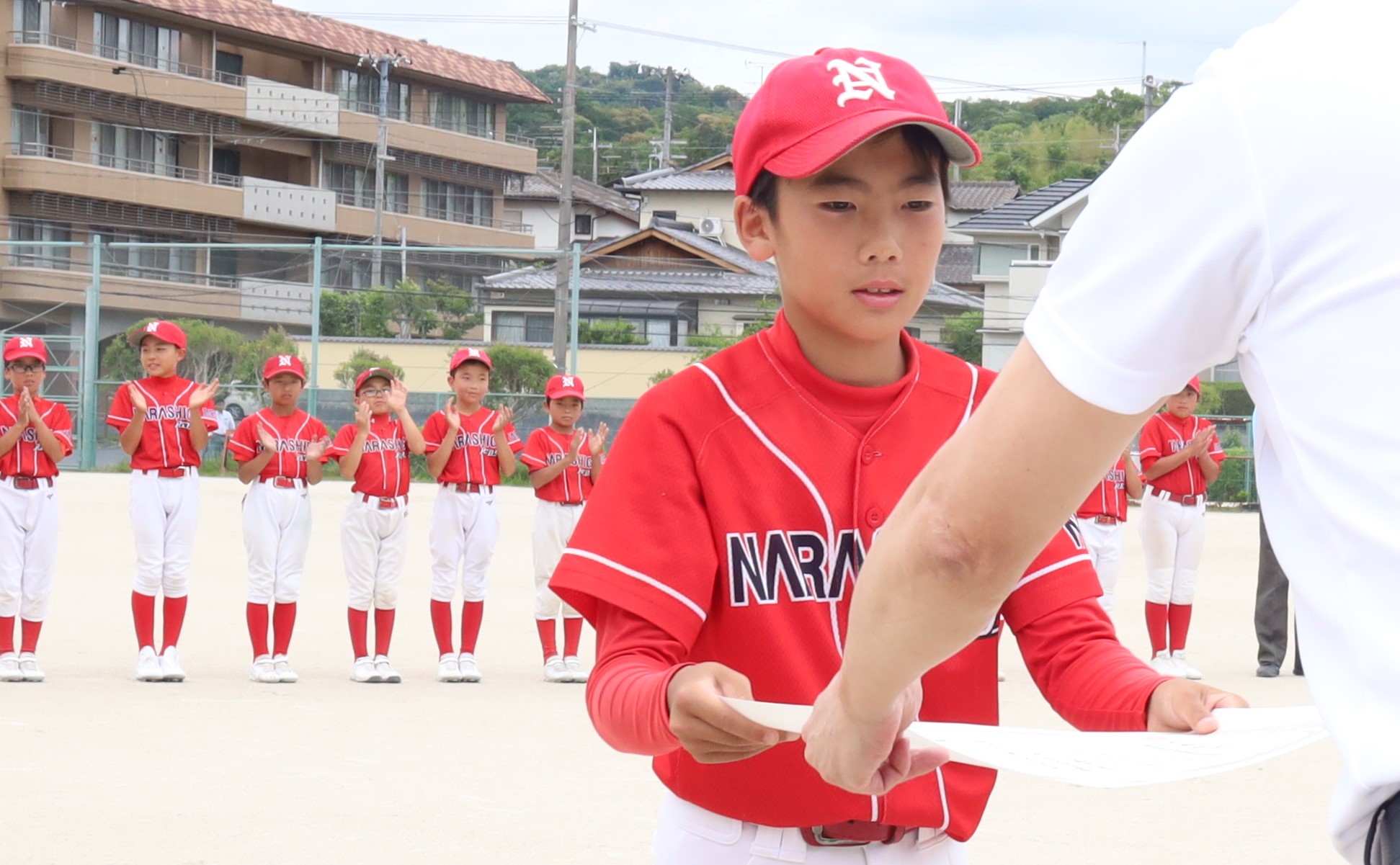 大会には同市と天理市、大和郡山市、生駒市、生駒郡、磯城郡から計16チームが出場。大安寺と奈良信貴REDS(生駒郡)との対戦となった決勝は、息詰まる攻防の末に大安寺が5ー4で競り勝った。宮本翔生主将(12)=6年=は「絶対勝ちたいという思いで試合に臨み、つなぐ野球ができた。最高です」と喜びを語った。このほかの結果は、次のとおり。