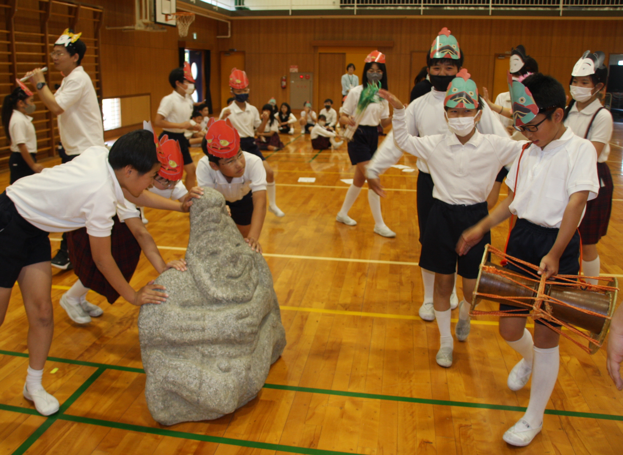 「伎楽の魅力知ってほしい」出前授業で明日香小の児童たちが体験