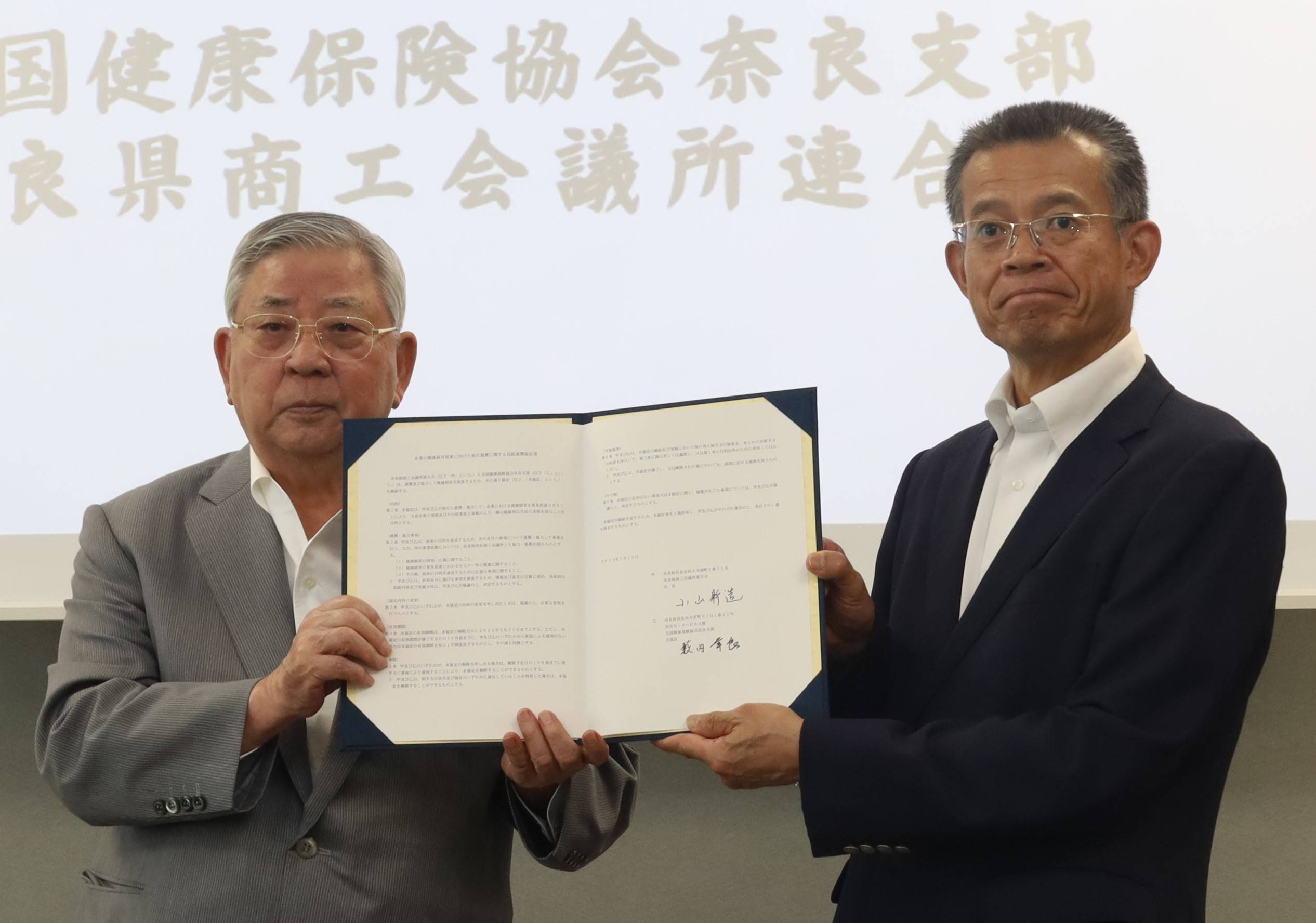 奈良県商工会議所連合会と協会けんぽ奈良支部が、県内企業に対する「健康経営」の普及・促進を狙いとした包括連携協定を締結した。