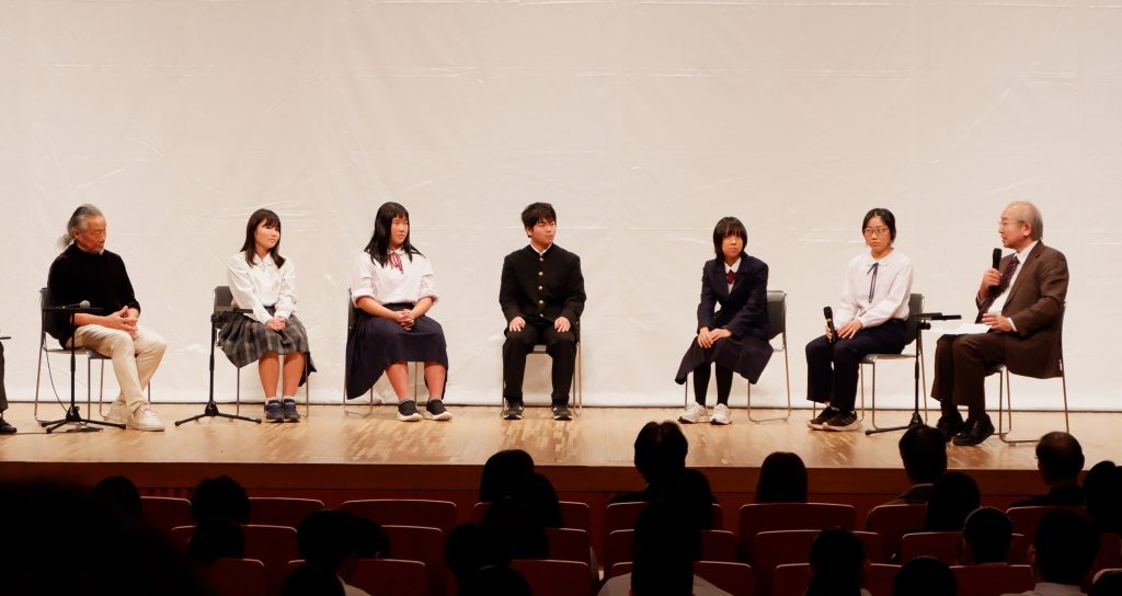 壇上で生徒たちと話す柴田一成名誉教授(右端)と喜多郎さん(左端)=大和郡山市