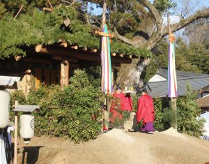 朱が塗り替えられ色鮮やかになった大社一之鳥居の近くにある「影向(ようごう)の松」は、春日明神が現れて舞ったという伝承があり、能舞台鏡板に描かれた松のルーツとされる。そんな芸能の聖地で「松の下式」が行われ、猿楽座が舞いの「弓矢立合(たちあい)」などを、田楽座が曲芸を披露した。