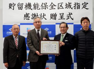 今月16日には地域住民に対する感謝状の贈呈式を開催。上田清市長は「線状降水帯など年々増える大雨被害に備えるため、住民の方のご理解をいただけたのは感謝しかない」と話し、感謝状を番条町自治会の沢田忠匡会長に手渡した。市は今後、同地区での指定区域の拡大を目指す方針という。