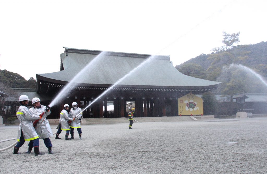 焼失した神楽殿は平成8年に再建され、神楽殿や拝殿の周囲に放水銃を設置するなど防火対策を強化した。当時の火災を知る上田宗弘権宮司は「神宮にとって2月4日は忘れてはいけない日。訓練を機に防火意識を高め、いざというときにも適切に行動できるよう努めたい」と話した。