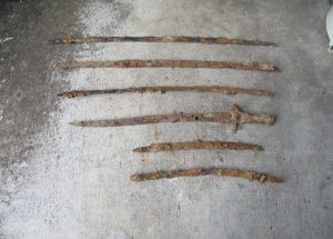 奈良県警は、同県御所市の高田警察署分庁舎(御所警察庁舎)の改築工事現場で、銃のようなもの60~70点程度、刀剣のようなもの6点が見つかったと発表した。いずれも腐食が進み、さびたように見える。いつ製造され、なぜここから発見されたのか謎で、関心が高まっている。県文化財課は明治以降につくられた可能性が高く、埋蔵文化財にはあたらないとみている。