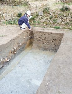 さらに今年1月から始まった調査では、後円部を発掘。南端で人の手が加わった箇所が地層に見られ、基底石との位置関係から、墳丘の裾と考えられるという。