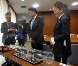 「配管くん」の説明を聞く奈良市の仲川げん市長(中央)と中部トータルサービスの大橋章子社長(右)=同市役所