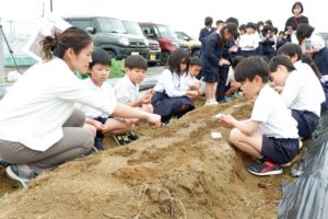 今月9日には、市立井戸堂小で種まき授業を実施。同社事業推進部の尾曾(おそ)菜穂子さんが講師を務め、児童ら35人に種の画像を見て植物の名を当てるクイズを出したり、植物が育つのに大切な要素「土の栄養・空気・水・太陽光」を説明したりした。その後、児童らは同校敷地内の畑の畝で種をまいた。