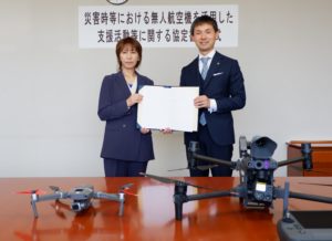 協定書には、災害時のドローンによる被害状況の調査や被災者の捜索、災害現場地図の作成、物資輸送、建物危険診断のほか、平時のドローンを活用した防災訓練への参加や技術支援、市職員への操縦指導なども盛り込まれている。