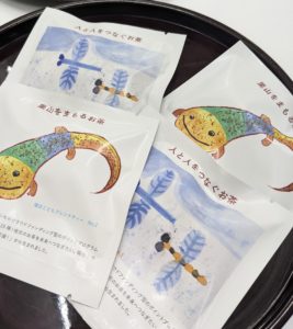 完成したのは、ローズゼラニウムとホーリーバジルが入った「里山をまもるお茶」と、ローズゼラニウムとレモンバーベナ、ペパーミントが入った「人と人をつなぐお茶」の2種。それぞれパッケージも児童らが手掛け、大和高原に生息するヤマトサンショウウオとトンボ、里山の風景のイラストが描かれている。