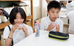 試飲会では、児童生徒らがお茶うけとともにブレンドティーを堪能。小学6年の女児は「苦みの中に甘みやさわやかさを感じた。おいしい」と満足そう。開発にかかわった5年の男児は「後味すっきり。多くの人にこのお茶を飲んでもらいたい」と笑顔を見せる。