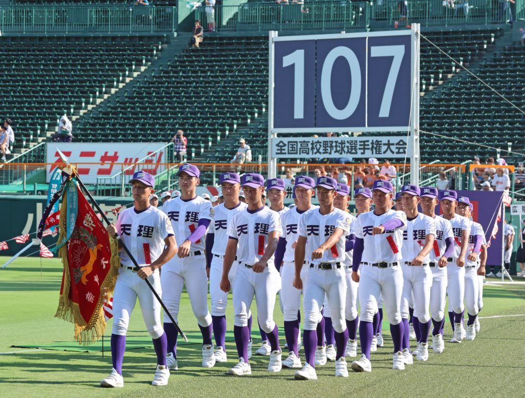 第107回全国高校野球選手権大会は5日、甲子園球場(兵庫県西宮市)で開幕した。開会式では、県代表として、3年ぶり30回目の夏の甲子園出場となる天理の選手たちが力強く入場行進した。