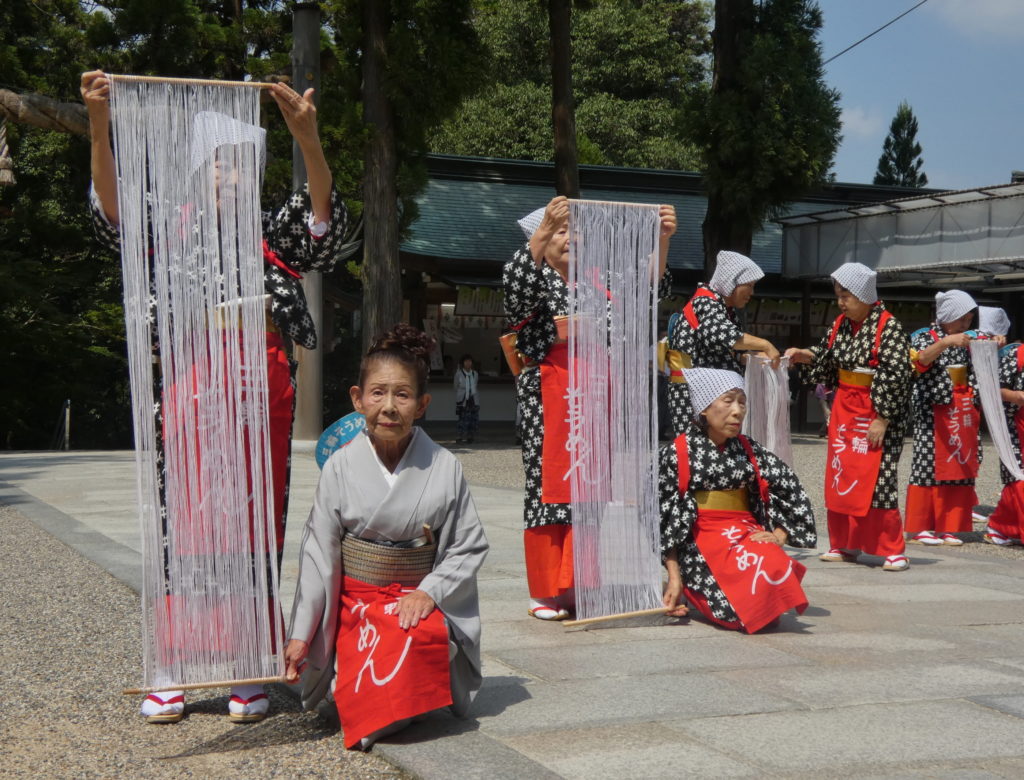 祭典には県三輪素麺工業協同組合(小西幸夫理事長)と県三輪素麺販売協議会(池田利一会長)などの関係者が出席。神職が祝詞(のりと)を奏上し、巫女(みこ)が神楽(かぐら)「浦安の舞」を奉納した。拝殿前では、赤いたすきに前掛け姿の保存会の女性たちが、そうめん作りを再現した三輪素麺掛唄(かけうた)や三輪そうめん音頭を披露した。