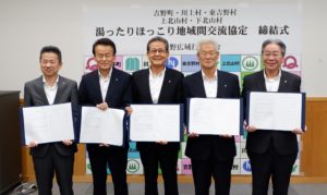 吉野郡東部に位置する吉野町と川上村、東吉野村、上北山村、下北山村が、町村内の公共温泉6施設の相互利用を促進する「湯ったりほっこり地域間交流協定」を締結した。9月1日から、5町村民は6施設すべてを住民価格で利用できるようになる。県南部の過疎化が進む中、町村民たちが互いに施設を行き来することで、地域のにぎわいにつなげる狙いだ。